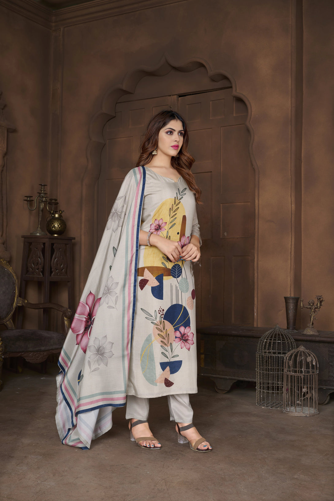 Our 3 Piece Tasser Cream Suit Set In Pure Viscose Fabrics,