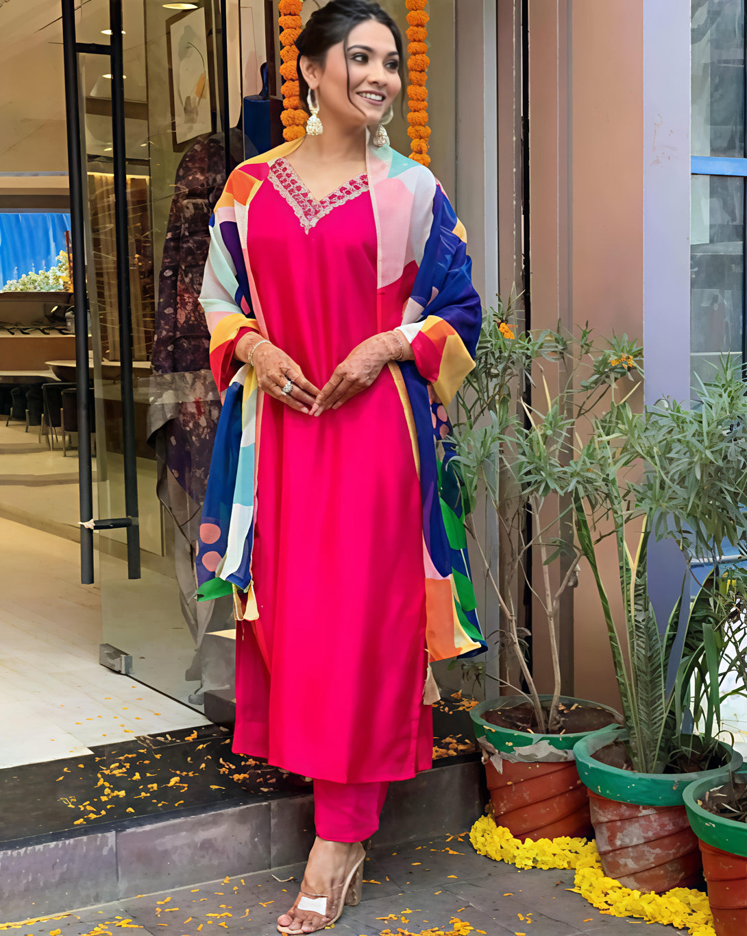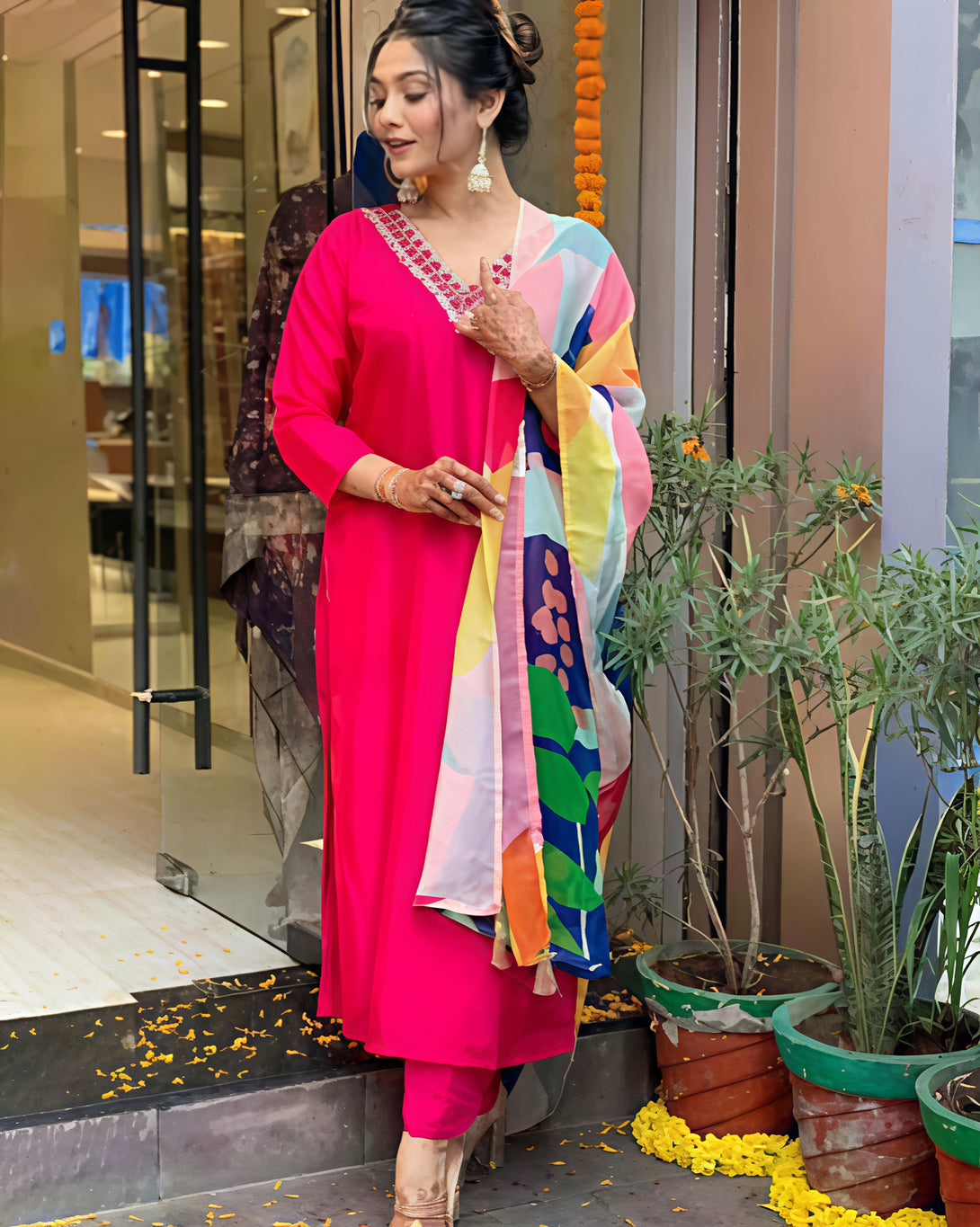 - This set includes: 1 Kurta and 1 Pant with Dupatta Printed || Work :- Printed & Neck Embroidered || Neck Style:- Round Neck